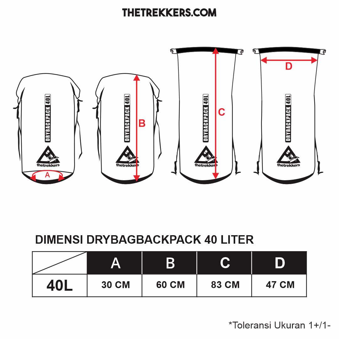 Spesifikasi Produk : -Bahan : PVC 550 (100 % waterproof ) -Kapasitas : 40 Liter -Tali Ransel : Backsystem -Metode Penyambungan : Hot Welding dan HF Welding