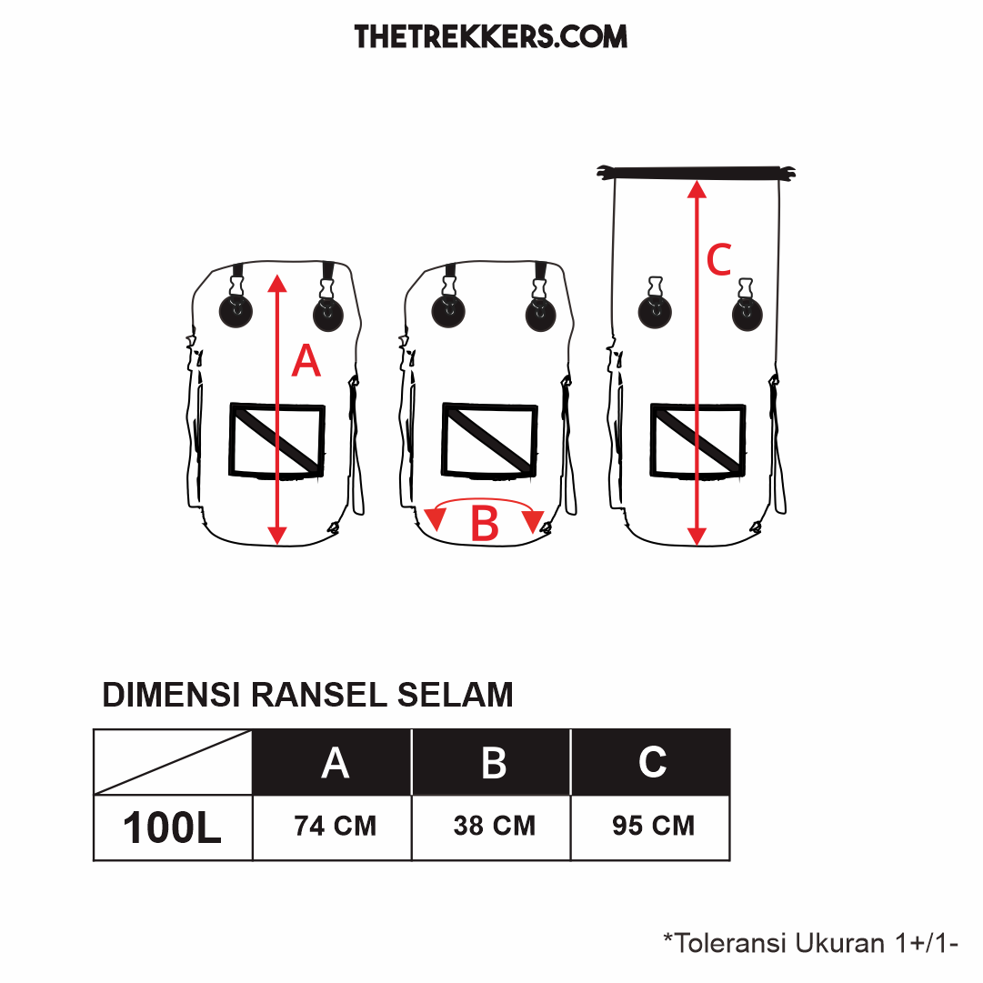 Spesifikasi Produk : -Bahan : PVC 550 (100 % waterproof ) -Kapasitas : 100 Liter -Tali Ransel : Webbing -Metode Penyambungan : Hot Welding dan HF Welding